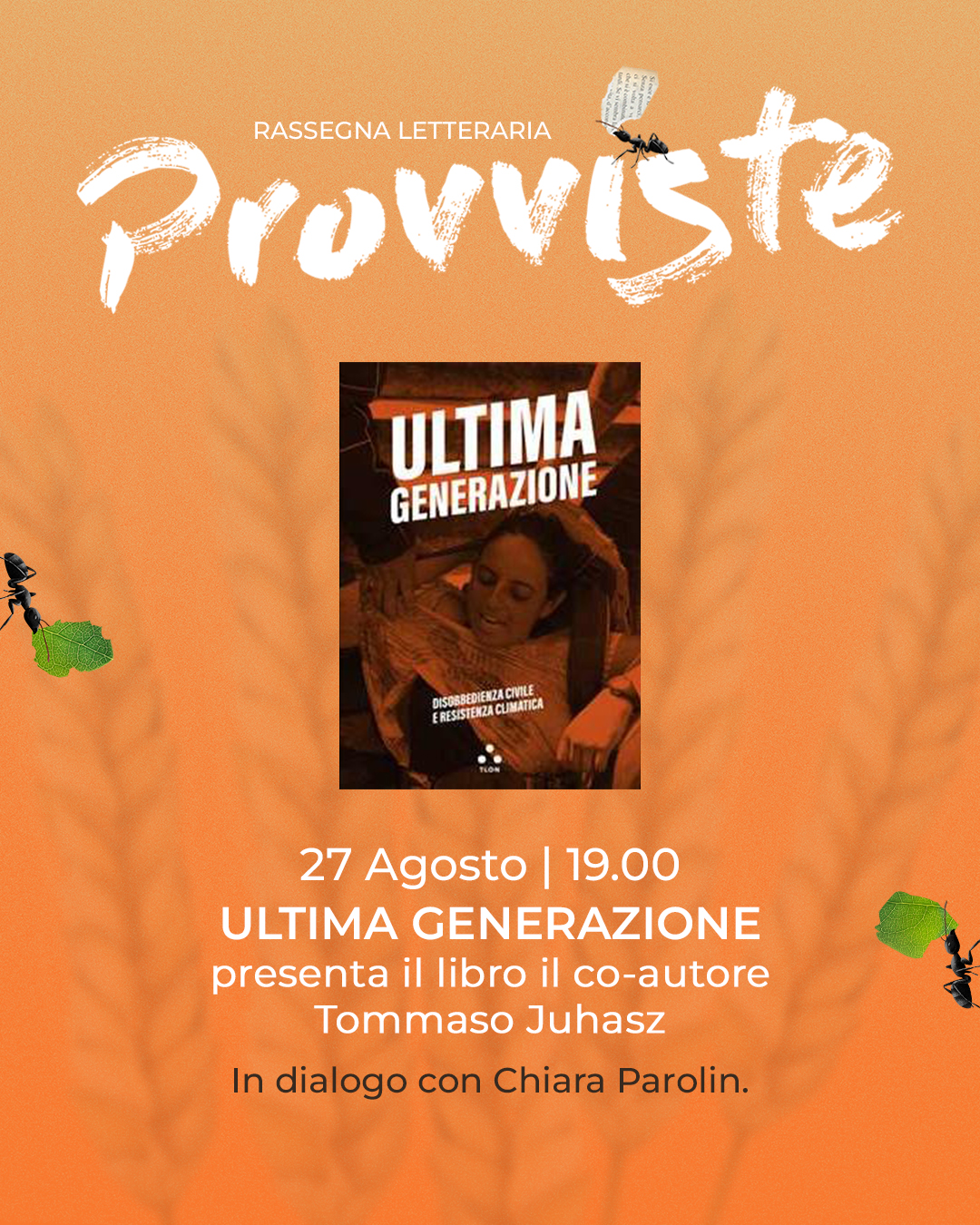 đź“… Mercoledì 27 agosto | đź•– 19.00 - Torna #Provviste🌅 📍 Lazzabaretto  Un viaggio dentro Ultima Generazione, il movimento che ha scelto la disobbedienza civile e la lotta alla crisi climatica come forma di impegno. Il co-autore Tommaso Juhasz dialoga con Chiara Parolin e ci guida tra testimonianze personali, motivazioni intime e azioni collettive […]